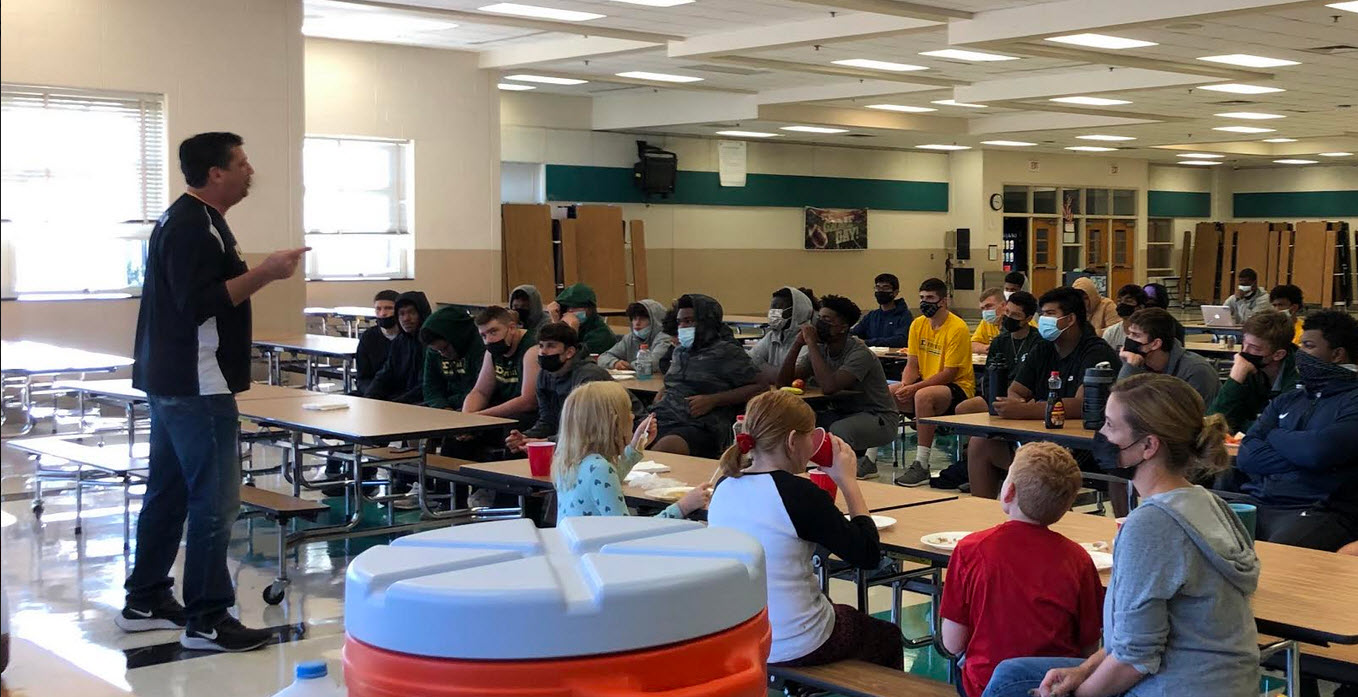 Coach Lutz is regularly invited by local high schools as well as summer camps to give skills clinics, motivational talks and mentoring sessions. Here, he talks with athletes at Damascus High School.